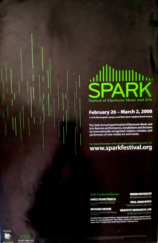 “This event featured performances, installations and lectures by internationally recognized creators, scholars, and performers of new media art and music.”… and I was there too. Performers were invited to submit ideas for papers for the lecture series. Much to my surprise my idea was accepted and I had to quickly write “Sound as Object”. It was somewhat politely received by the assembled academics.