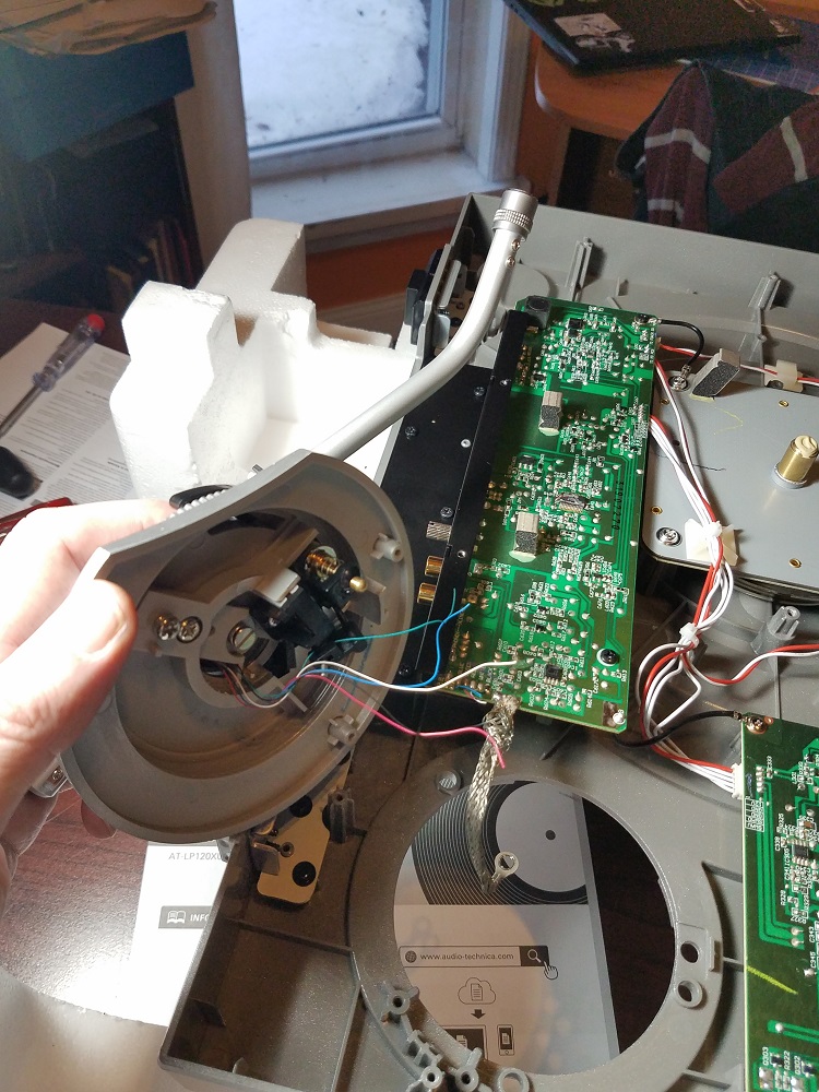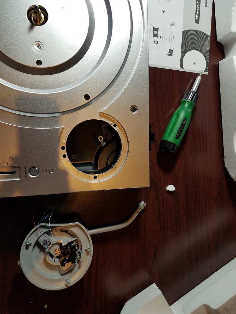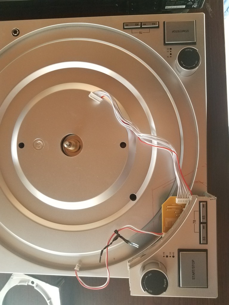 The short version of this is that I’ll be removing the tonearm assembly & circuitry from one unit and try to attach it in the right location, so that it will play on the other two turntables when they are placed side by side.