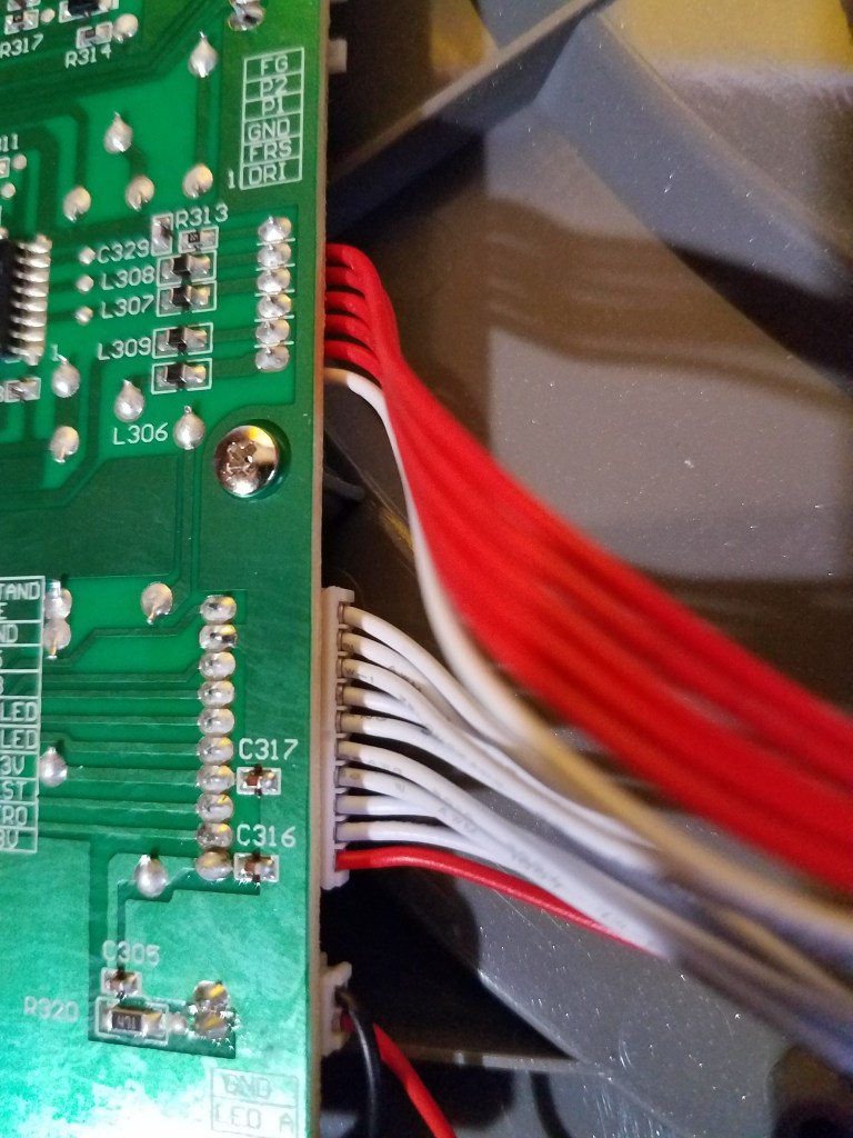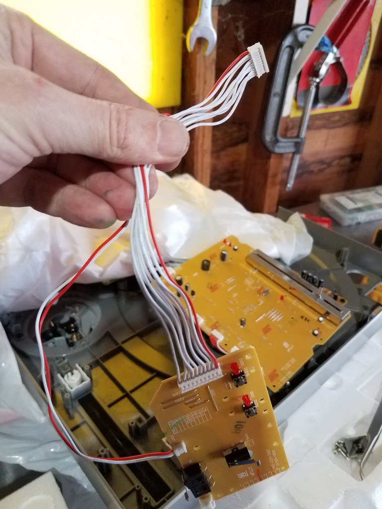 Unfortunately, with the new location, the set of ten wires going from this circuit board to the main control would not be long enough. Fortunately, I have a spare. By cutting the wires at the base of the clip I will be able to connect them to the other set. Nine white and one red.