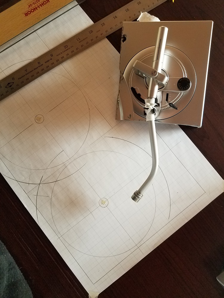The center of the spindle is 210 MM from the pivot points of the tonearms, so the location of the third tonearm has to be at a place where those two arcs cross.