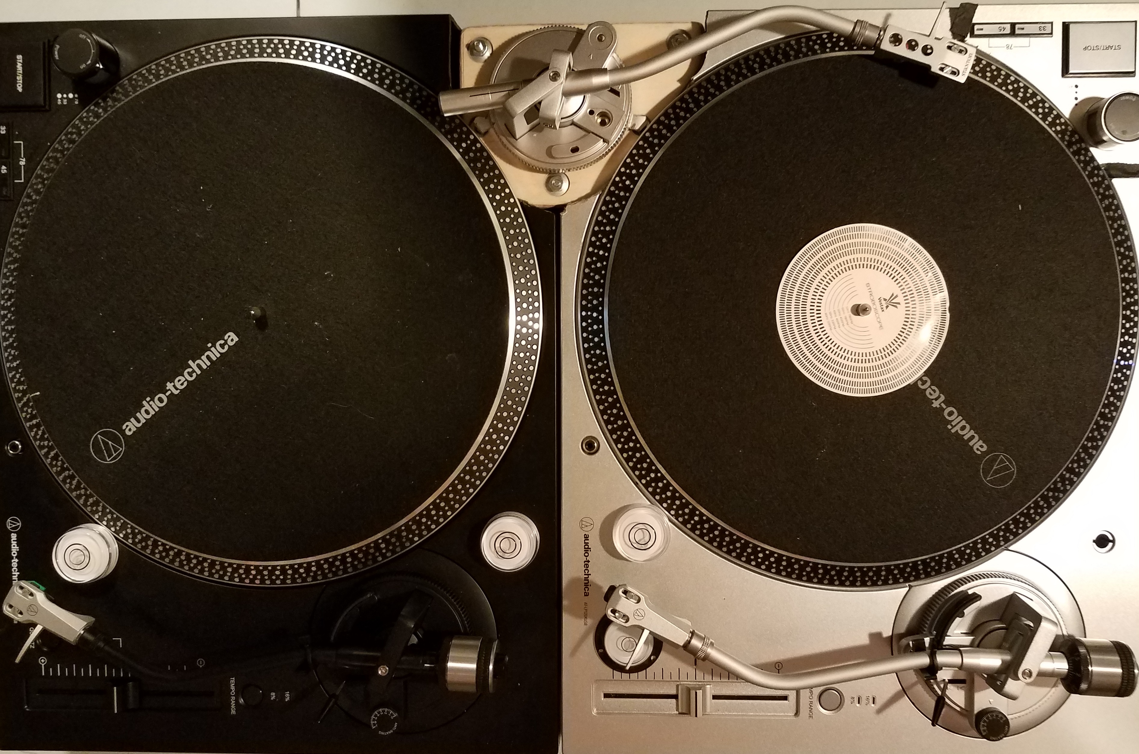 The pictures below showcase the third tonearm and the customized counter-weight assembly. Because the tone-arm needed a greater range of motion than standard, the supplied counter-weight couldn’t be used because it limited this motion by bumping against the anti-skate dial. The answer turned out to be a very simple and I think elegant, solution. An allen-wrench with a few washers placed on the end! The allen-wrench fit into the hole that was already in the end of the tone-arm, and clears the dial that it needed to fit over so that it can play on both turntables. Recently upgraded the three cartridges to Ortofons that make the visual act of DJing so much easier